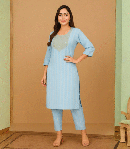 • Sky Blue Embroidered Cotton Kurti with Salwar Pant for Women ( Earrings &Hair clip ) Free From: ₹5,199.00 Original price was: ₹5,199.00.₹999.00Current price is: ₹999.00.