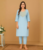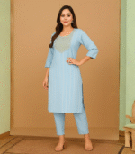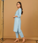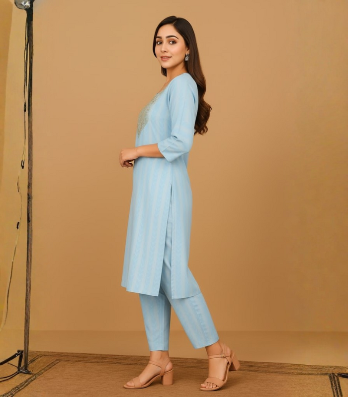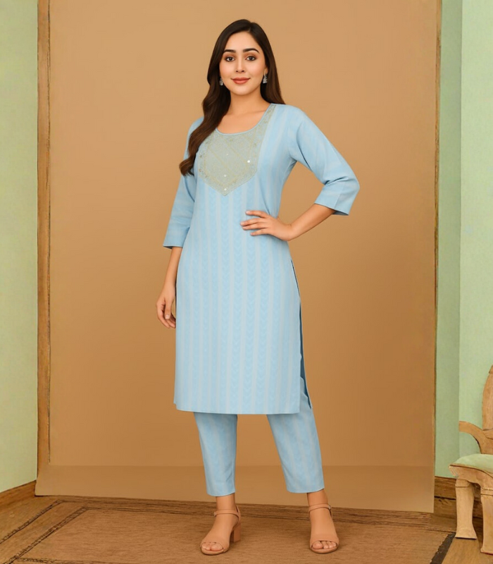 Step into style and comfort with this Sky Blue Embroidered Cotton Kurti and Salwar Pant set. Designed with a subtle pattern and elegant embroidery on the yoke, this outfit perfectly balances simplicity and sophistication. Crafted from premium cotton fabric, it ensures all-day comfort while keeping you effortlessly chic. Ideal for office wear, festive occasions, or casual outings — this Kurti set adds a refreshing touch to your wardrobe.