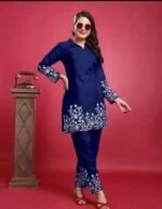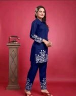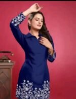 Sky Blue Embroidered Cotton Kurti with Salwar Pant for Women ( Earrings &Hair clip ) Free
