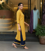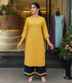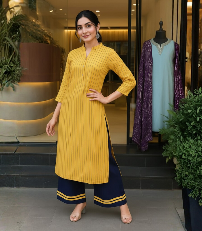 Add a pop of sunshine to your wardrobe with this Mustard Yellow Striped Kurti paired with a Navy Blue Palazzo. Crafted from premium cotton blend fabric, this set offers all-day comfort and effortless elegance. The mandarin collar and sleek vertical stripes give it a modern, sophisticated look — perfect for office wear, festive gatherings, or casual outings. Stay chic and confident wherever you go with this stylish Kurti Palazzo set.
