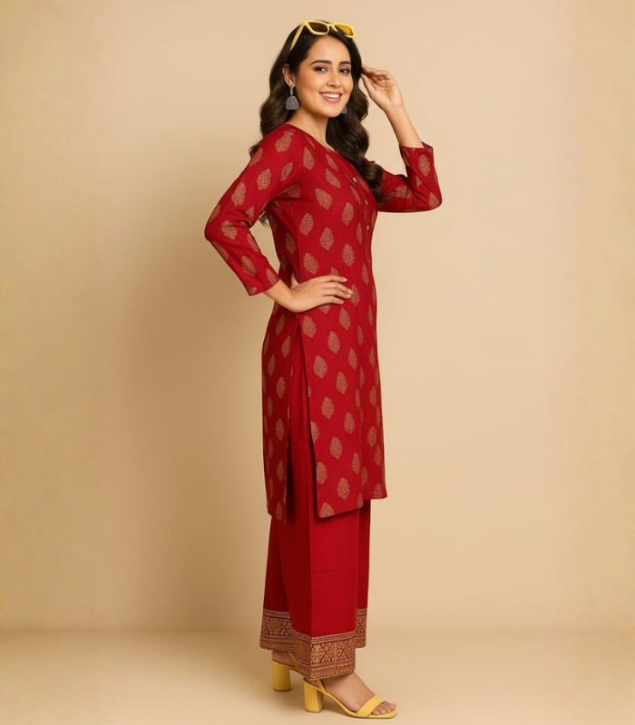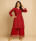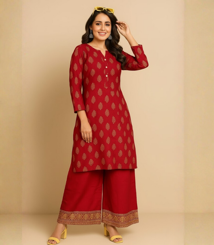 Make a bold style statement with this elegant Red Printed Kurti and Palazzo Set. Crafted from soft, breathable fabric, it features a beautiful golden leaf print, a stylish neckline with buttons, and a straight-fit design for a flattering look. The matching palazzo pants with intricate border detailing add a touch of sophistication. Perfect for festive occasions, office wear, or casual outings—this outfit brings together comfort and ethnic elegance effortlessly!