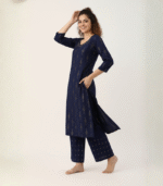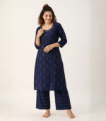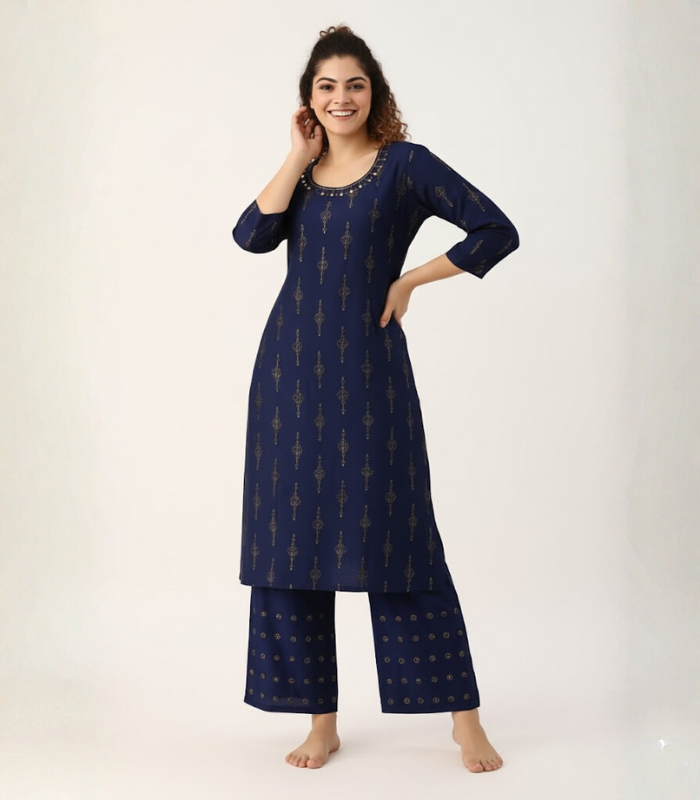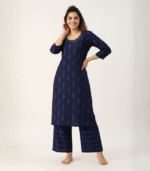 Elevate your ethnic look with this elegant Navy Blue Printed Kurti and Palazzo Set. Designed with a soft, breathable fabric, it features intricate golden prints, a stylish round neckline with subtle detailing, and three-quarter sleeves for a refined finish. The matching palazzo with coordinated motifs adds comfort and sophistication, making it perfect for festive events, office wear, or casual gatherings. Step out in effortless style and comfort with this timeless ensemble.